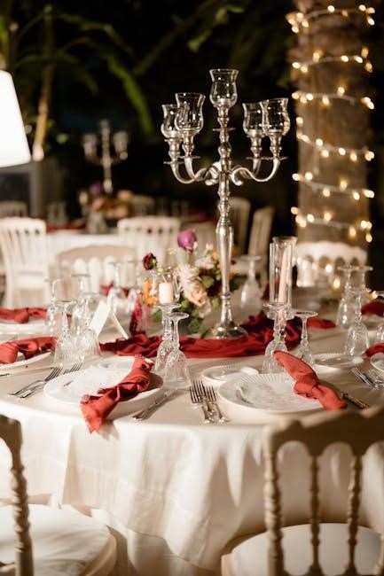 Mendelssohn’s Wedding March is originally scored for a full orchestra‚ including strings‚ woodwinds‚ brass‚ and percussion. The piece features a grand orchestration‚ with the strings often carrying the main melody‚ while the woodwinds provide harmonic support. The brass section‚ particularly trumpets and trombones‚ adds a triumphant and celebratory tone‚ especially in the climax. The percussion‚ including timpani and cymbals‚ underscores the rhythmic energy. The orchestration creates a balance of power and elegance‚ making it ideal for ceremonial use. Smaller arrangements‚ such as those for organ or piano‚ are also popular‚ preserving the march’s emotional impact in more intimate settings. The versatility of the instrumentation allows it to be adapted for various ensembles‚ ensuring its widespread use in weddings and performances. The full orchestral version remains the most iconic‚ embodying the joy and grandeur of the occasion.